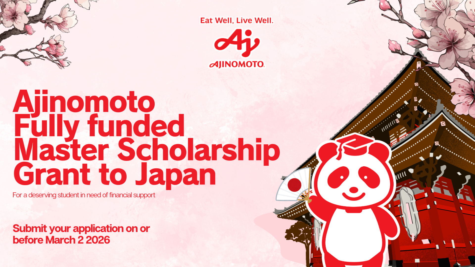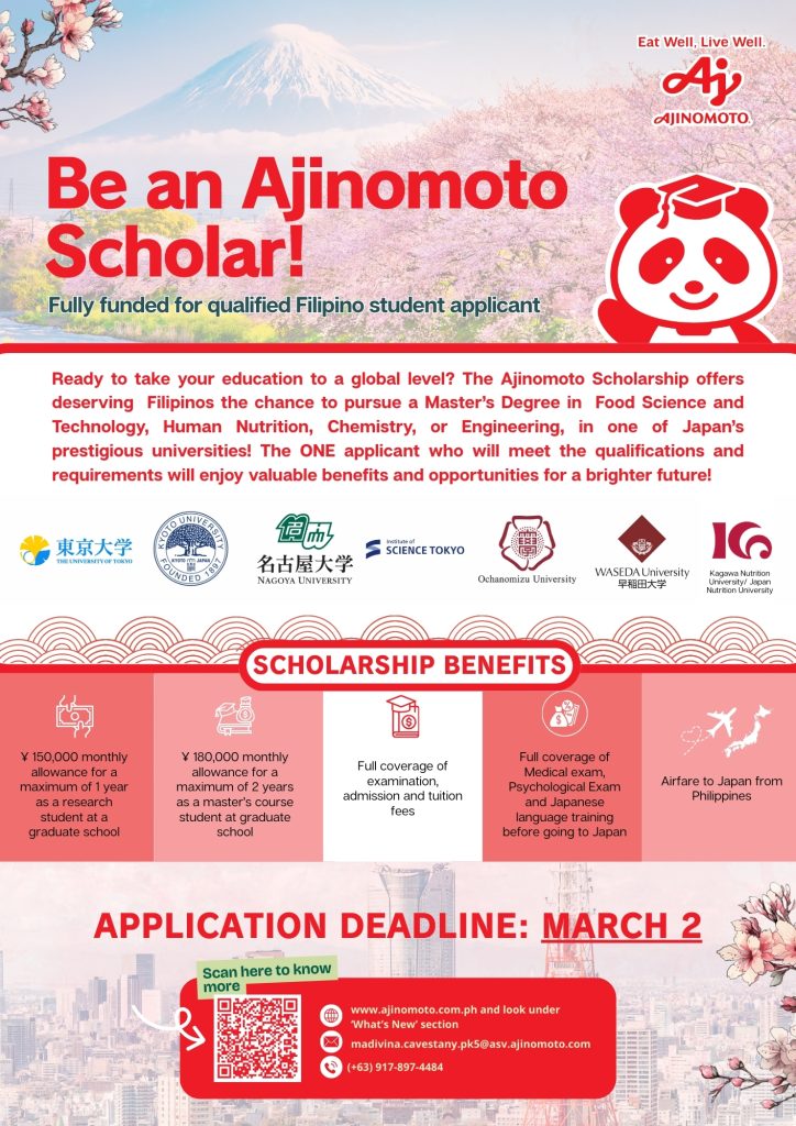 visithttps://www.ajinomoto.com.ph/whats-new-archive/2027-ajinomoto-foundation-postgraduate-scholarship-grant/. The deadline for sending applications is March 2, 2026.